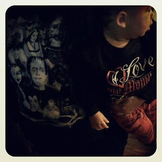 When Mason was younger I went on a shopping spree for cool shirts, well of course he grew out of them. Since it's winter I found a cool idea for all those shirts. So I sewed shirts to sweaters, I also made my self one!